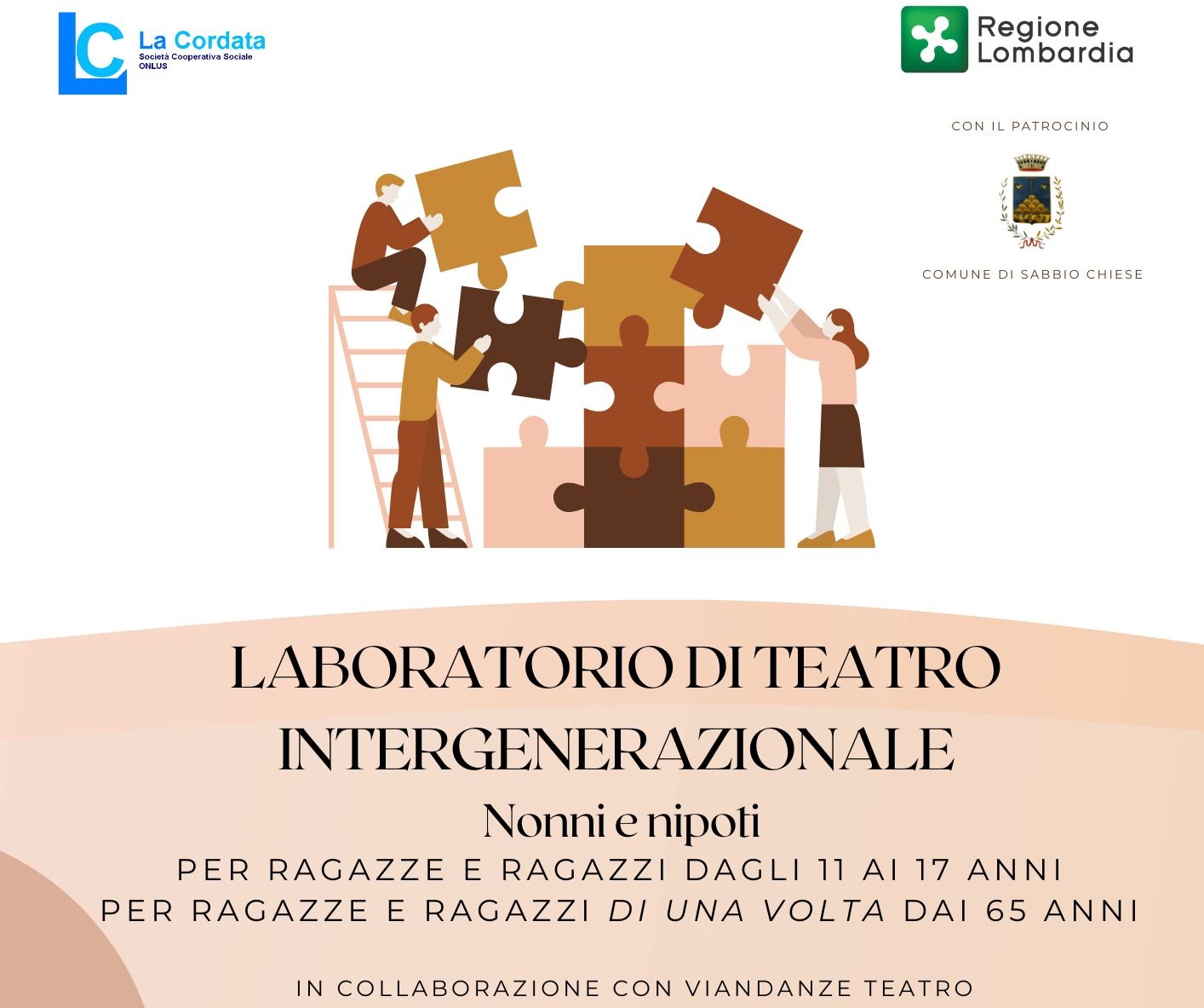 La Commissione Politiche Giovanili del Comune di sabbio Chiese propone il consueto corso di teatro in collaborazione con “Viandanze Teatro”. La settimana edizione nasce con uno spirito INTERGENERAZIONALE: un percorso aperto a ragazze e ragazze dagli 11 ai 17 anni ed alle ragazze e...